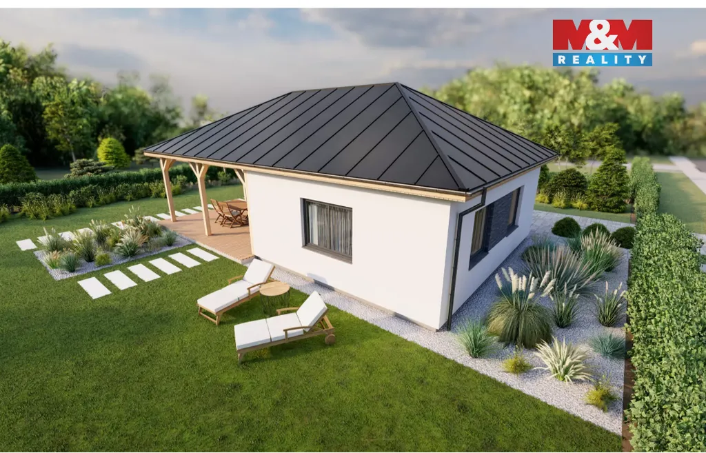 Dům je navržen jako moderní jednopodlažní stavba, která splní požadavky menší rodiny i páru. A co je nejlepší – interiér si každý klient vybírá podle svého vkusu. Podlahy, dveře, koupelna – vše bude přesně podle Vašich představ.