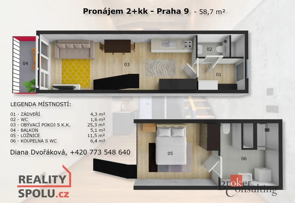 Nabízím k pronájmu zbrusu nový, dosud neobývaný byt o dispozici 2+kk s balkónem, o celkové ploše 58,7 m². Byt je situovaný v moderním rezidenčním projektu Lofty Kolbenova v žádané lokalitě Praha 9 – Vysočany.
