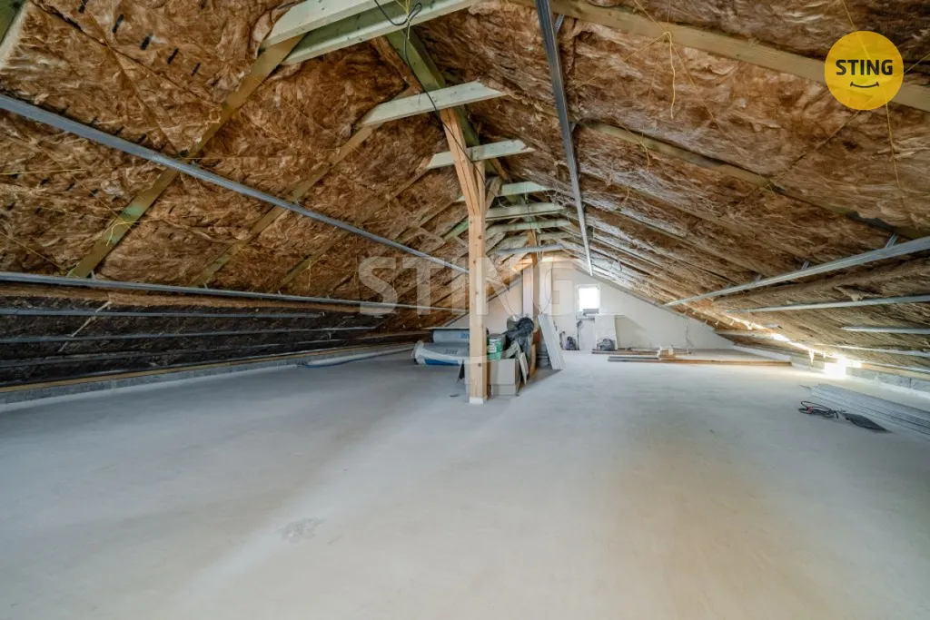 V patře najdete otevřené podkroví, které po dokončení nabízí další obytné možnosti, včetně možnosti vybudování další koupelny i WC, což je již nyní připraveno.