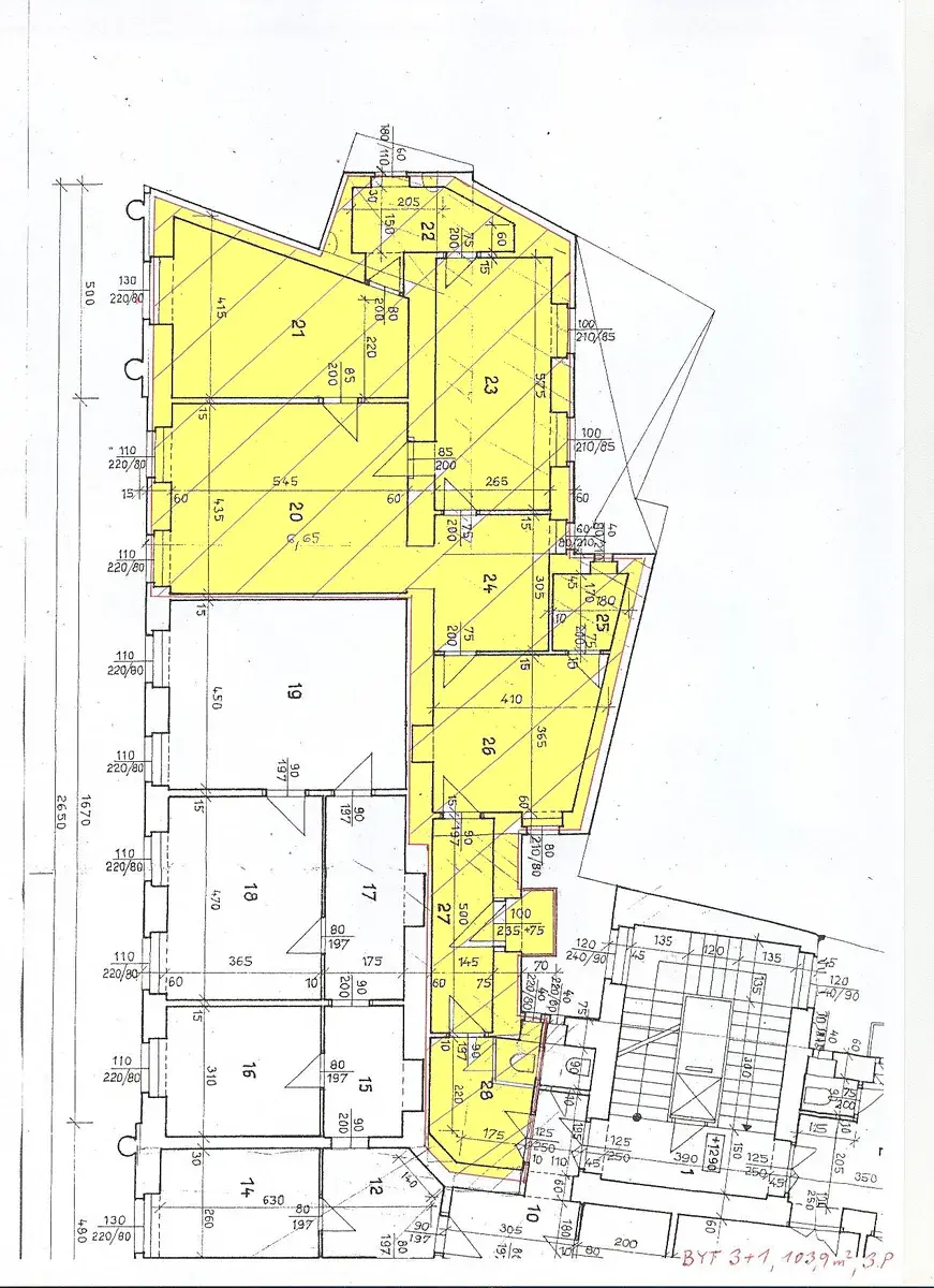Nabízíme k pronájmu byt 3+1 o celkové rozloze 103,9 m2 ve 3. patře domu s výtahem na ulici Masarykova v Brně. Byt má místnost předsíně, ze které se vstupuje do místnosti chodby, a dále do místnosti kuchyně (v půdorysu označené 24 a 26, nyní spojené v jednu velkou místnost kuchyně). Z kuchyně je vstup i do místnosti komory označené v půdorysu 25. Byt má dále tři samostatné pokoje (dva průchozí s okny do ulice Masarykova a jeden s okny do dvora), dále místnost koupelny, kde je vana a WC. V bytě je ještě další samostatné WC se vstupem z předsíně. Před necelým rokem byl v bytě nainstalován nový úsporný plynový kotel, a to včetně vyvložkování komínu. V kuchyni je stávající kuchyňská linka se samostatně stojícím kombinovaným sporákem a digestoří. Další spotřebiče v bytě, jako je pračka a lednice, jsou movitým majetkem současného nájemce.
