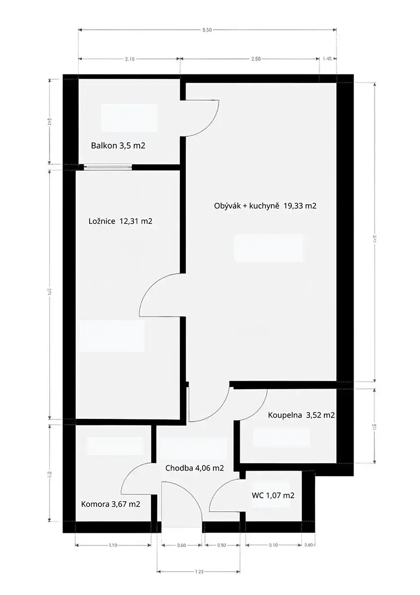 Výhodou je balkón se vstupem z ložnice i obýváku, který láká k příjemnému posezení u vína, či šálku kávy.