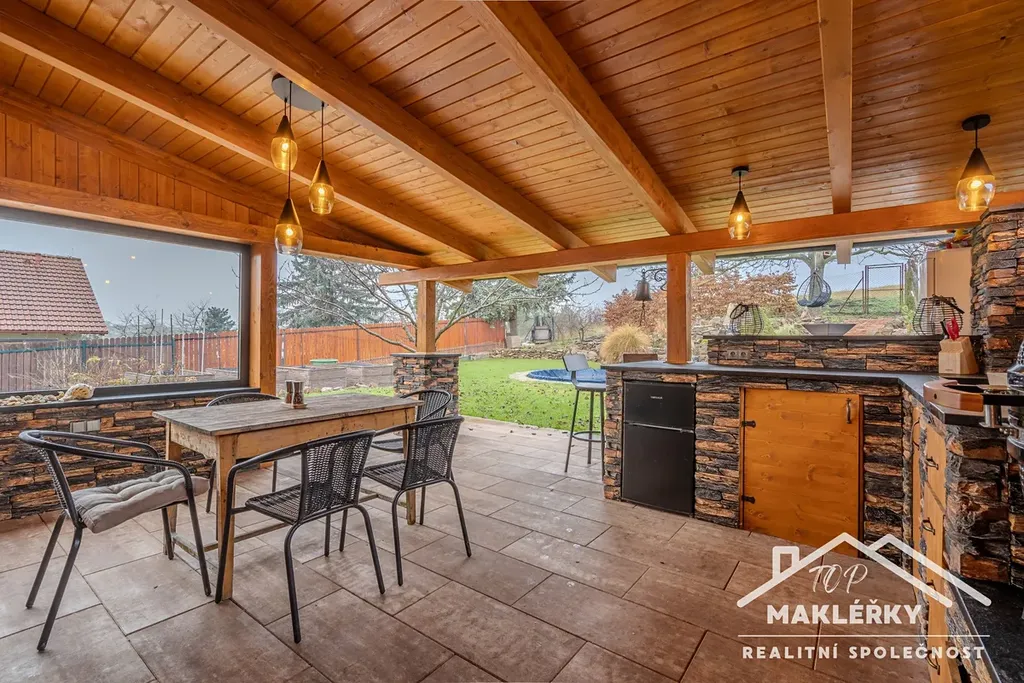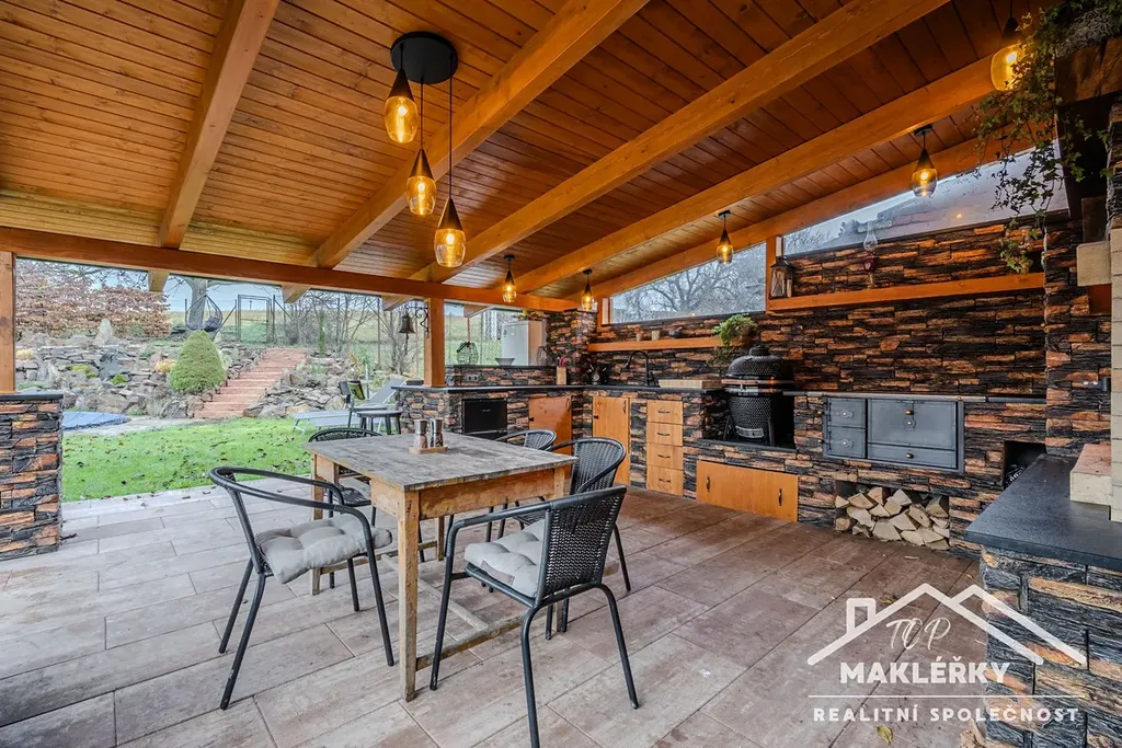 V letních měsících oceníte naprosto unikátní zastřešenou a ze tří stran uzavřenou letní kuchyni - dokončena v srpnu 2025. Pro uplatnění kuchařských kvalit je zde připraven gril, poctivá pec s pláty na vaření, udírna a samozřejmě nechybí prostorný krb. Nádobí opláchnete v granitovém dřezu vodou přivedenou z obecního vodovodu. V parních letních měsících využijete i zapuštěný kruhový bazén o objemu 20 m³. A kdyby bylo snad chladněji, je připraven solární ohřev.