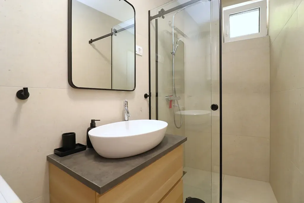 Apartmán o ploše 46 m2 umístěný v suterénu budovy sestává z jedné ložnice, koupelny, obývacího pokoje s kuchyní a jídelnou s přístupem na terasu a vlastní zahrádku o rozloze 20 m2. Majitelé apartmánu mají k dispozici prostorný společný dvůr o rozloze přibližně 200 m2 s krytou terasou, venkovní kuchyní/grilem a venkovní sprchu. Na oknech apartmánu jsou elektrické rolety a sítě proti hmyzu, bezpečnostní protipožární vstupní dveře, elektrické podlahové vytápění v koupelně, chodbě, a obývacího pokoje, klimatizace a TV přípojky v každé místnosti, moderní koupelnové vybavení a sanitární keramika. Apartmán je kompletně zařízený a veškerý nábytek je zahrnut v ceně. Apartmán je připravený k nastěhování a je vhodný jak pro celoroční bydlení tak i na pronájem. Apartmánu náleží 1 parkovací stání.