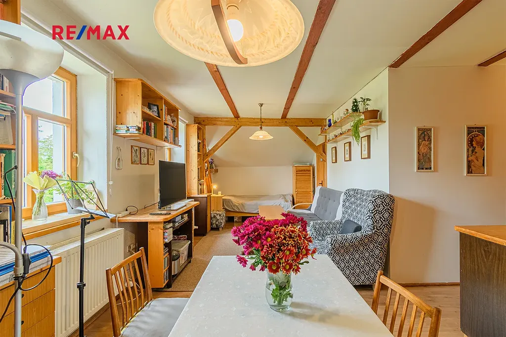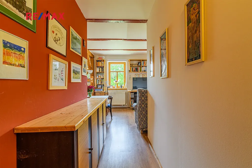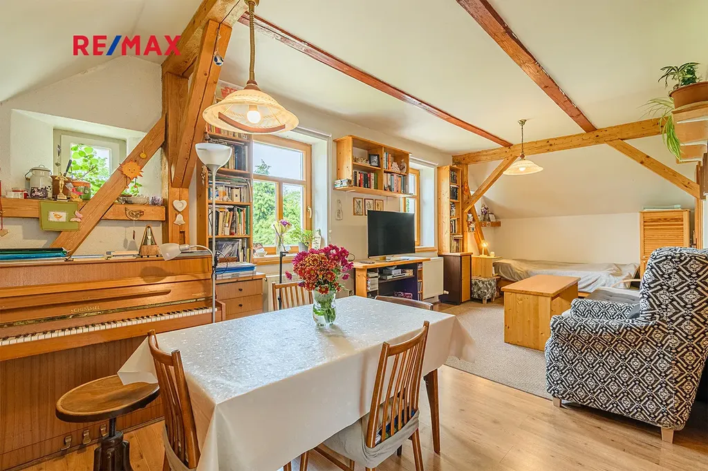Dalším obytným prostorem o dispozici 3+kk je horní patro domu, které prošlo v roce 2010 rozsáhlou rekonstrukcí. Tato hezky řešená dispozice je rozšířena o další místnost vybudovanou v podkroví, přístupnou z jednoho z pokojů. Pojetí této povedené rekonstrukce krásně navazuje na styl přízemí domu a podtrhuje celkový dojem nemovitosti.