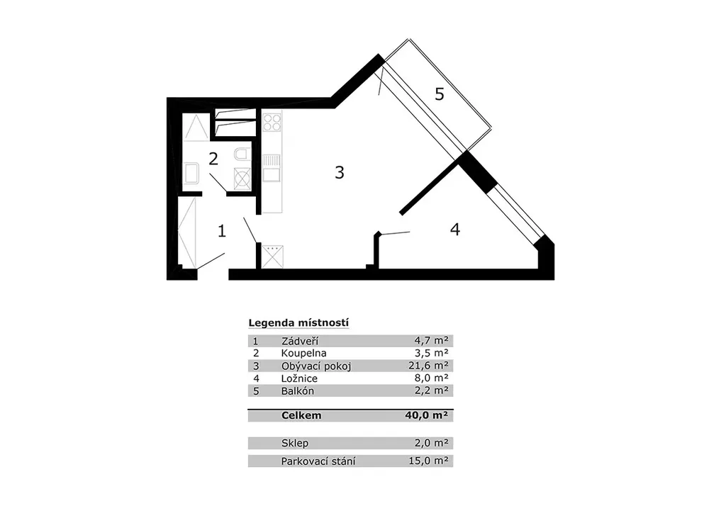 Bytová jednotka s celkovou užitnou plochou 38 m² se nachází ve třetím podlaží bytového domu s výtahem.