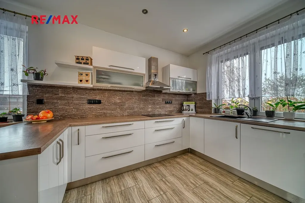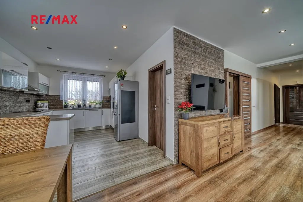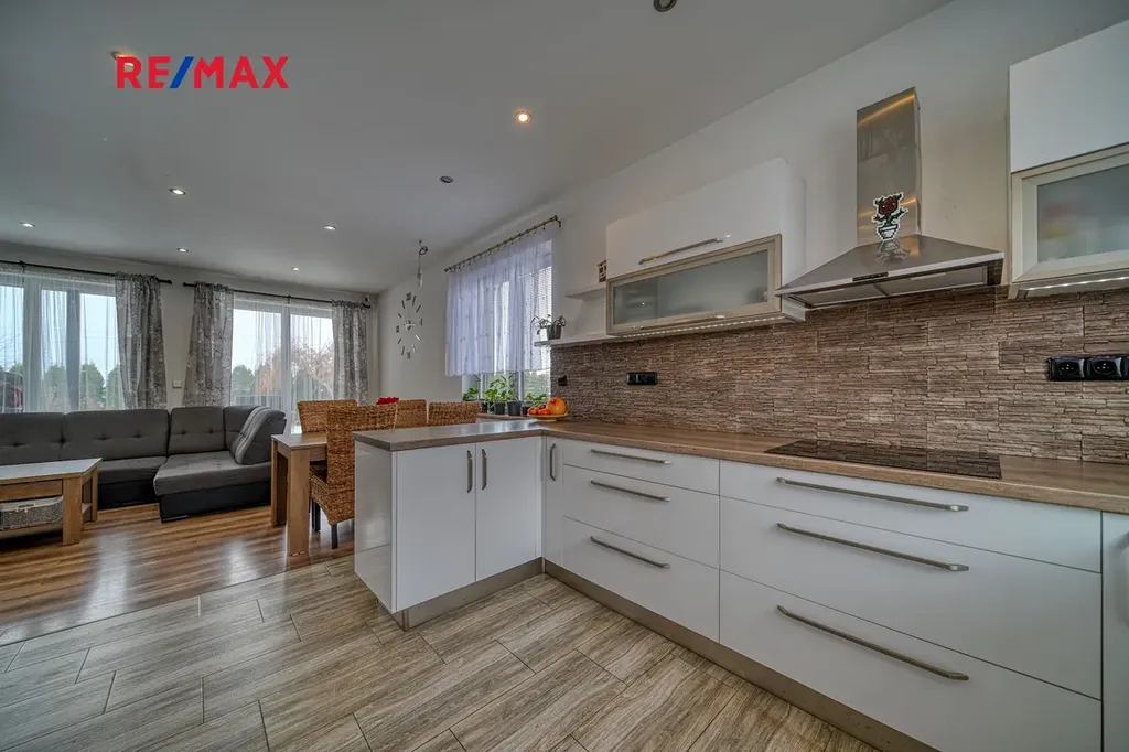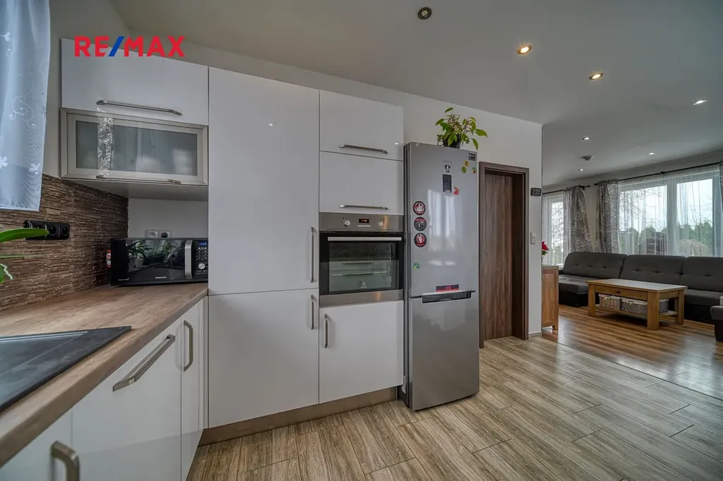 Praktická dispozice 4+kk nabízí prostorný obývací pokoj propojený s kuchyní. Kuchyňská linka je vybavena vestavěnými spotřebiči – indukční varnou deskou, troubou i digestoří – a doplněná o velmi praktickou spíž.
