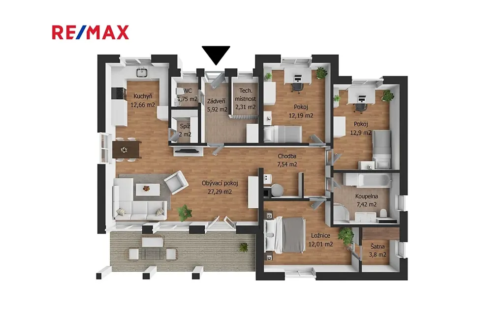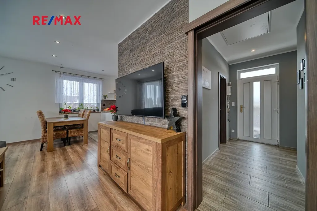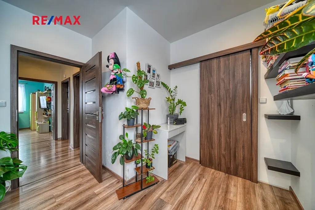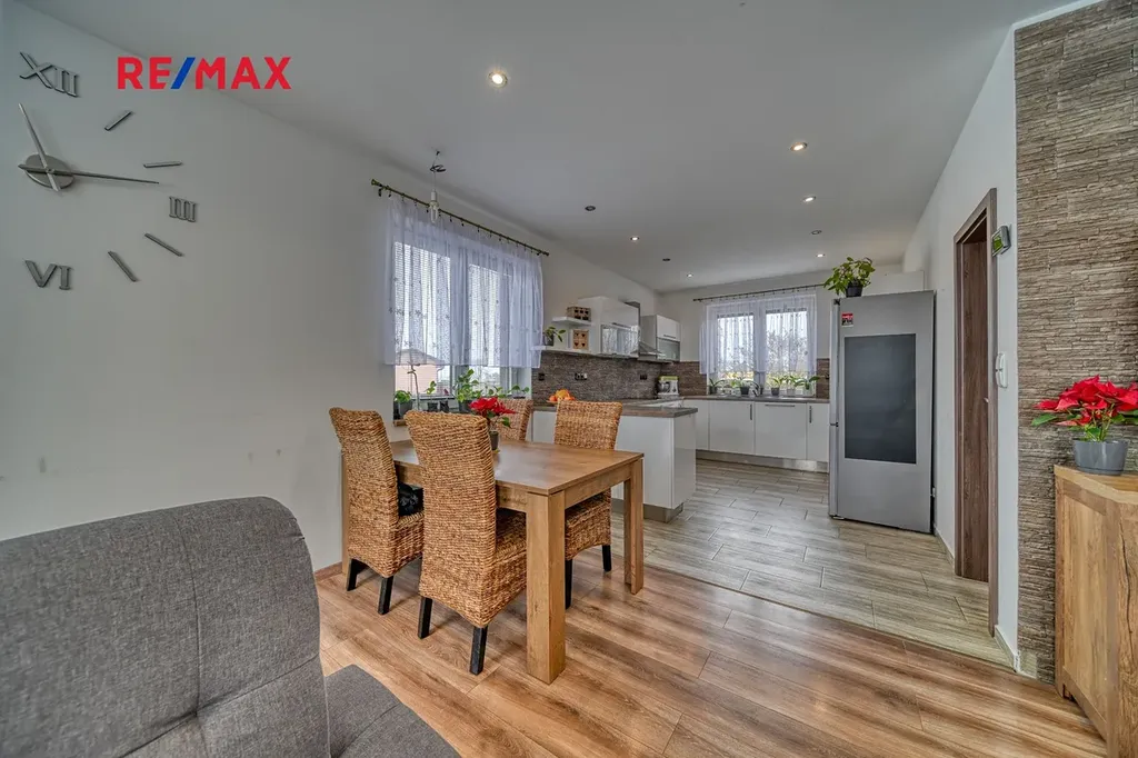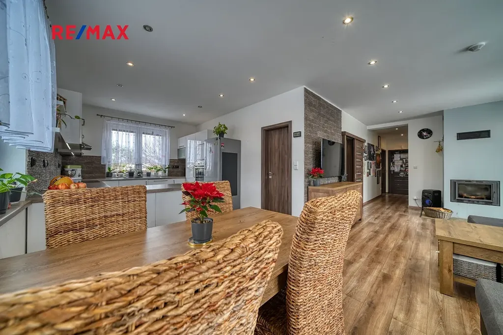 Praktická dispozice 4+kk nabízí prostorný obývací pokoj propojený s kuchyní. Kuchyňská linka je vybavena vestavěnými spotřebiči – indukční varnou deskou, troubou i digestoří – a doplněná o velmi praktickou spíž.