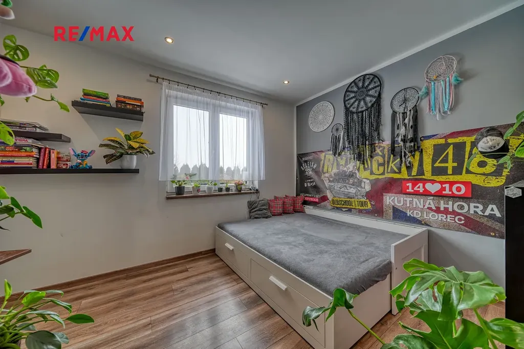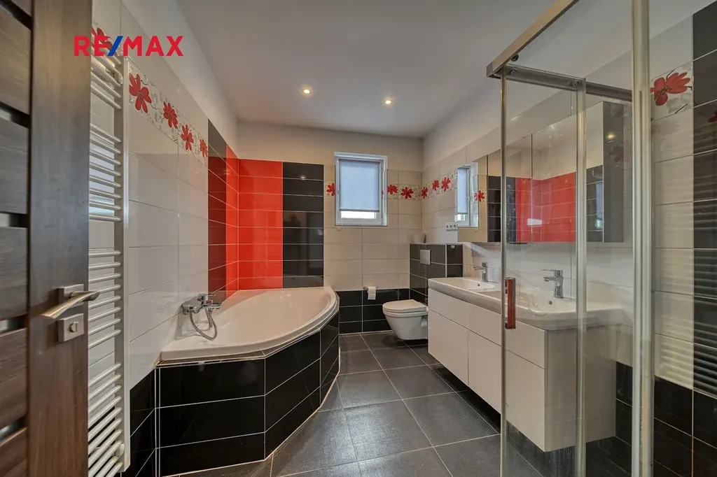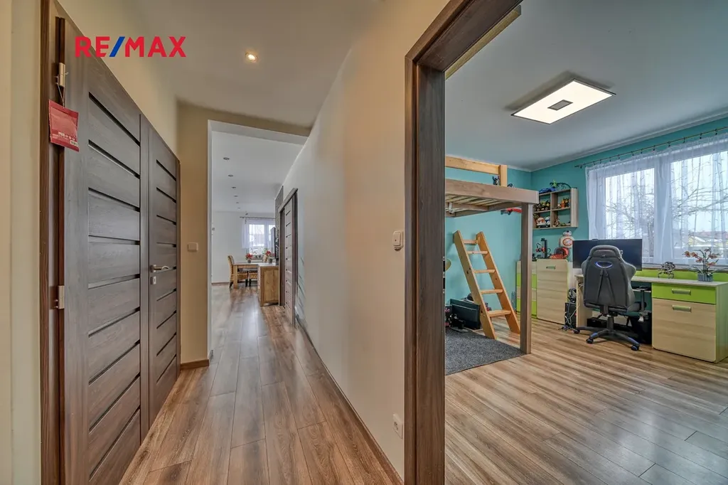 Dále zde najdete dva dětské pokoje, ložnici s vlastní šatnou, prostornou koupelnu s vanou, sprchovým koutem a WC. Druhé WC je samostatné.