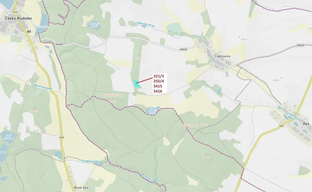 Lesní pozemky a vodní plocha o výměře 7 902 m2, parcelní čísla 221/3, 255/4, 5415, 5416, podíl 1/1, katastrální území Lidéřovice, obec Peč, obec s rozšířenou působností Dačice, okres Jindřichův Hradec, Jihočeský kraj.