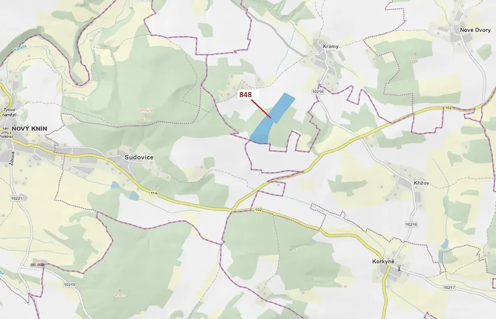 Lesní pozemek o výměře 81 658 m2, parcelní číslo 848, podíl 1/1, katastrální území Krámy, obec Nové Dvory, obec s rozšířenou působností Dobříš, okres Příbram, Středočeský kraj. Částečně po těžbě.