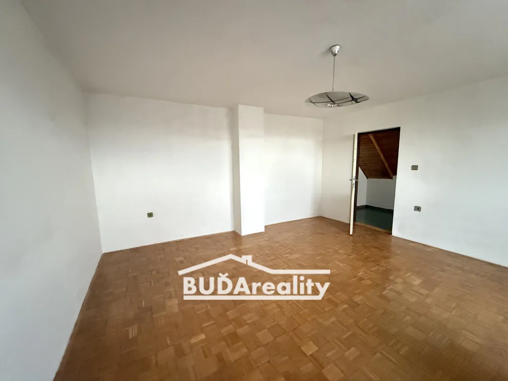V patře se nachází 2 pokoje, koupelna a podkroví. V podkroví se nabízí možnost vybudování dalšího pokoje. V této části se částečně vybudovala nová střecha. Krovy jsou v pořádku v celém podkroví.