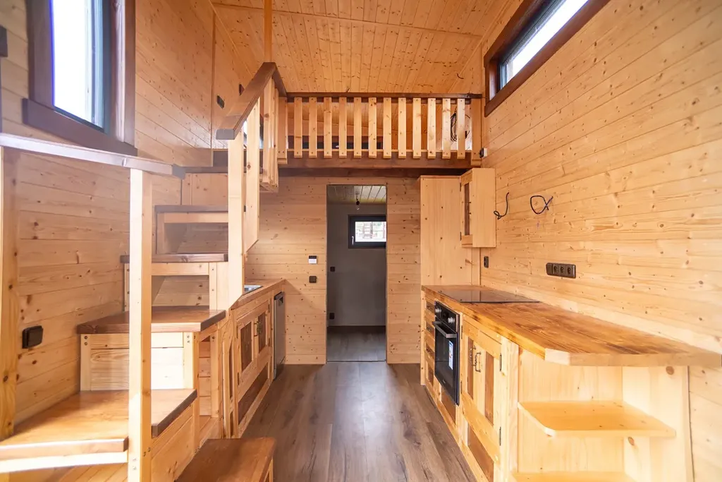 Možnost přimontovat terasu a schody. Výrobní cena byla 1.900.000,- Kč. Je aktuálně zaparkovaný v bezpečném areálu, připraven k odvozu. Stačí zapřáhnout za auto a odjet – Tiny House je okamžitě k dispozici.