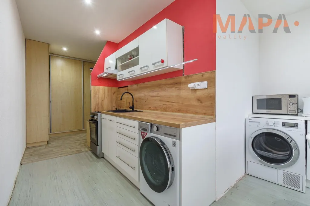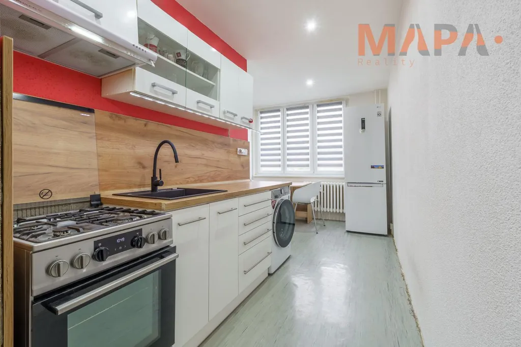 Kuchyně: linka, sporák, pračka, lednice, jídelní stůl + 3 židle