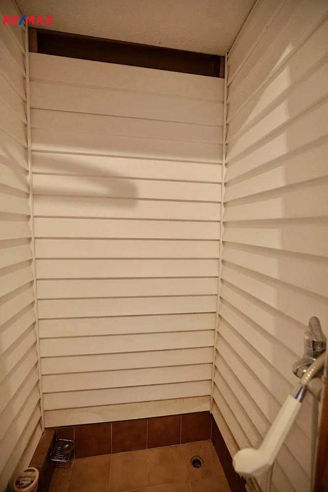 V přízemí domu je obývací pokoj s krbovými kamny, kuchyň, chodba, wc a sprchový kout (chybí klasická koupelna). V tomto podlaží je dále prostorná garáž, místnost s vícero využitím a menší sauna.