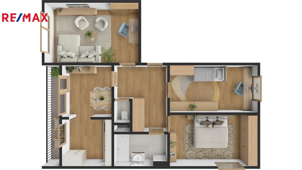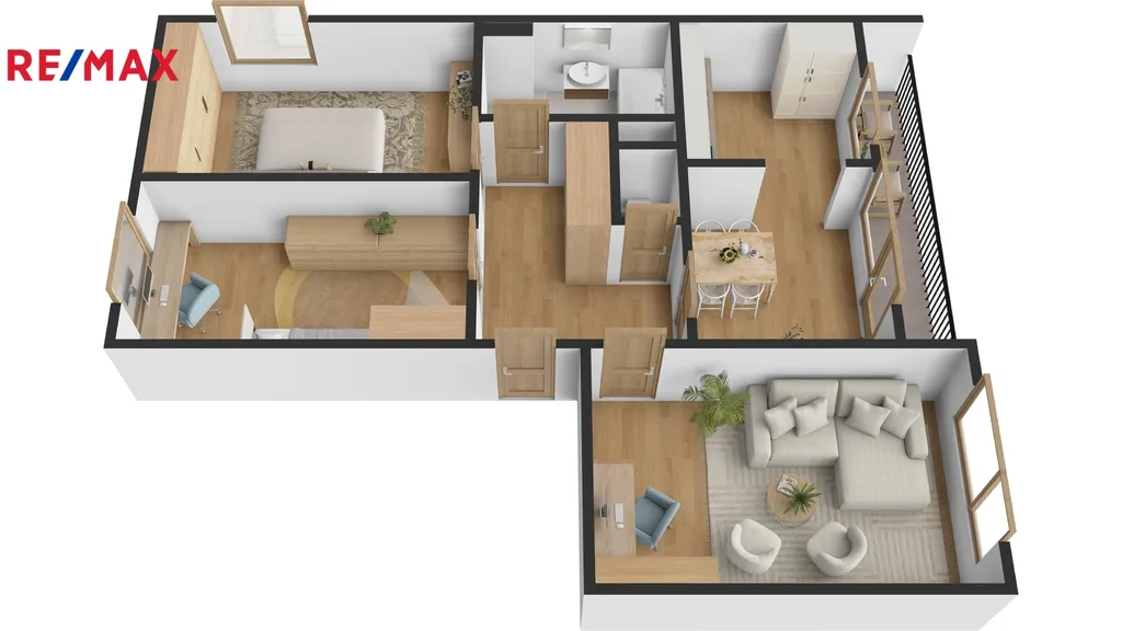 Byt je v původním, velmi udržovaném stavu a nabízí příjemnou dispozici s prostornou vstupní chodbou, ze které je vstup do všech místností. V chodbě jsou umístěny dvě šatní skříně. Samostatná koupelna je vybavena vanou a je v ní i místo pro pračku, toaleta je oddělená. Obývací pokoj je dostatečně velký pro velkou sedací soupravu a obývací stěnu. Kuchyň je prakticky propojena s jídelnou. Z jídelny se vstupuje na velkou lodžii orientovanou na jih. Další dva pokoje lze využít jako ložnici a dětský pokoj nebo pracovnu. K bytu patří i sklepní kóje umístěná v přízemí domu. K dispozici je společná kolárna. Výhodou je soukromé parkoviště před domem.