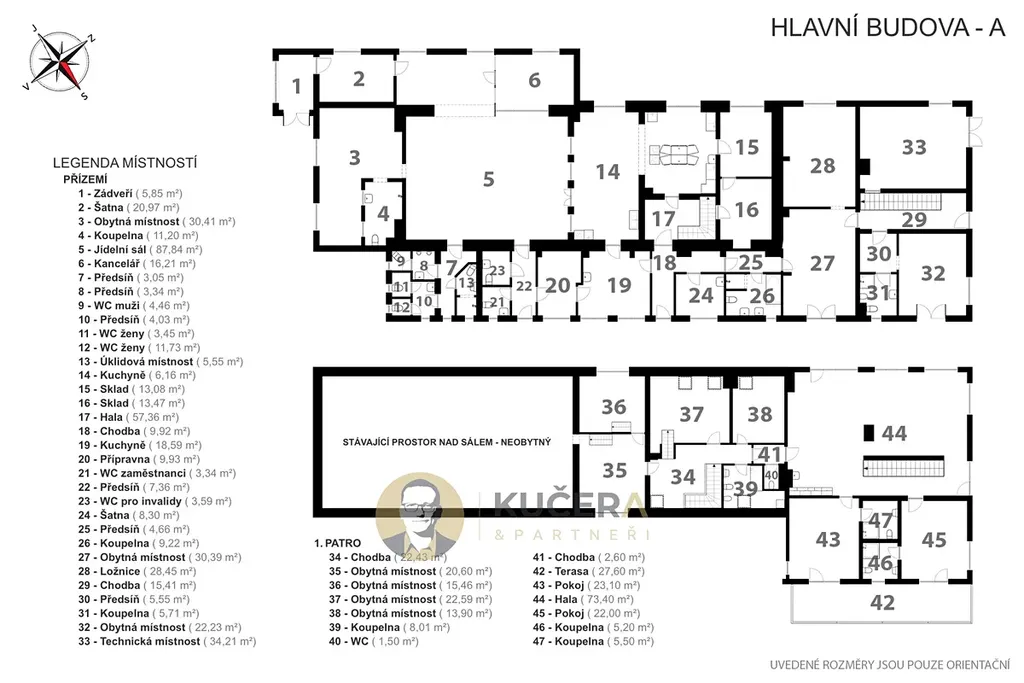 Pozemek má dle katastru nemovitostí celkovou plochu cca 5 634m² a dle územního plánu nabízí možnost další výstavby. Součástí areálu jsou tři objekty – hlavní rekonstruovaná budova (A) s číslem popisným a dva další objekty (B, C) bez čísla popisného, které čekají na své nové využití. Celková užitná plocha všech budov činí přibližně 550m².