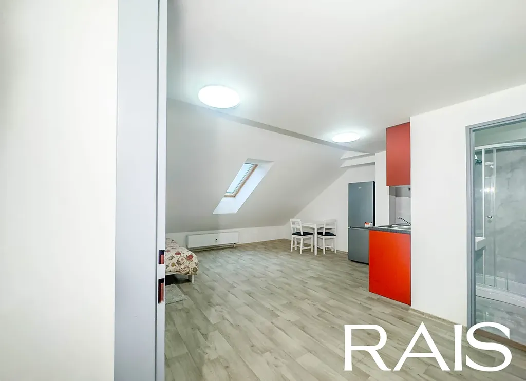 Podkrovní ateliérový prostor působí velmi příjemně, vzdušně a klidně, s pěkným výhledem na město. Prostorná koupelna je vybavena sprchovým koutem a nabízí dostatek místa. Moderní kuchyňská linka je osazena vestavěnou lednicí, troubou a indukční varnou deskou.