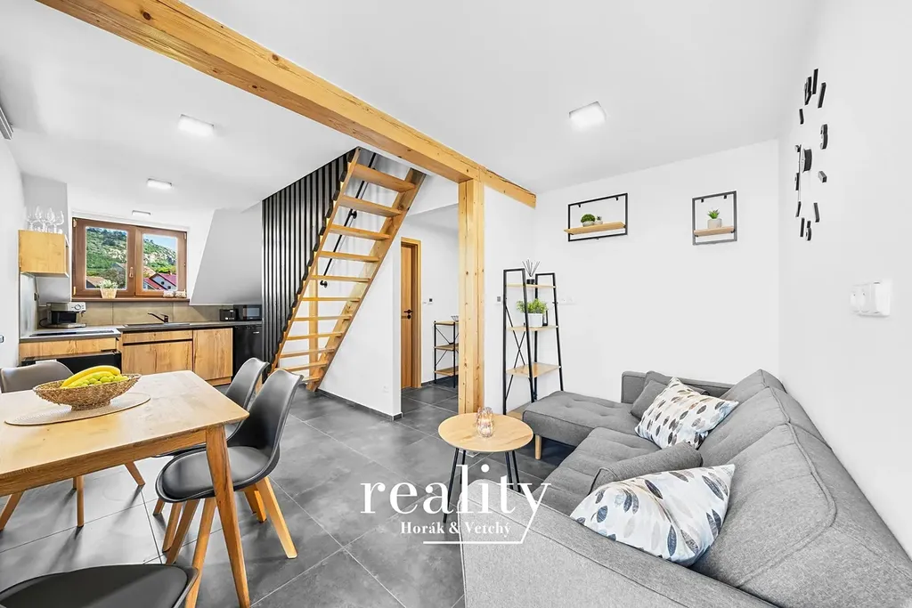 • Obytný prostor s kuchyňským koutem, jídelnou a vstupem na soukromou zahradu francouzskými dveřmi