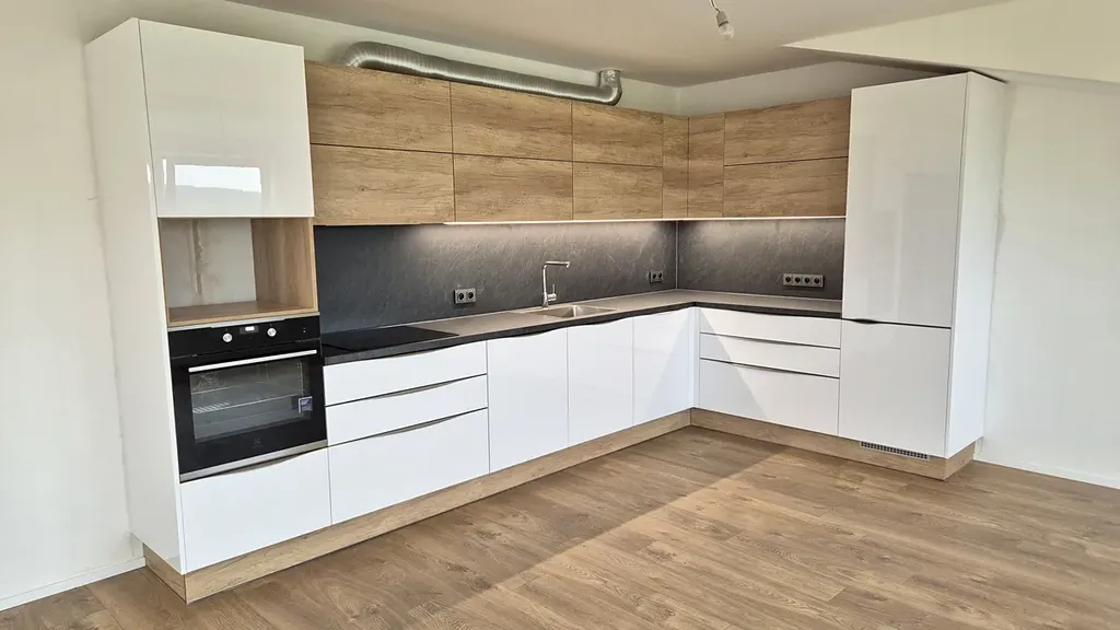 V bytě je nainstalována moderní a kvalitní kuchyň. Na foto chybí mikrovlná trouba, ale v bytě již samozřejmě je. Osvětlení je již také nainstalováno (na foto stav před instalací). V bytě je také příprava pro klimatizaci a po dohodě je možné ji dodělat.