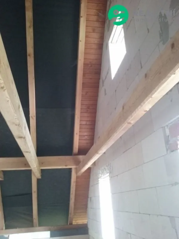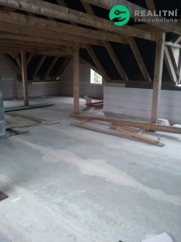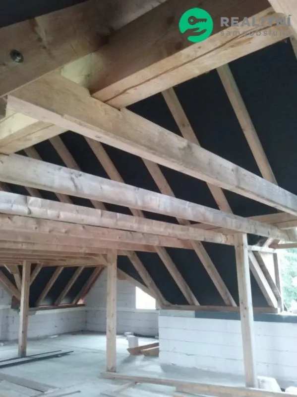 1PP (částečně odkryté mírný svah), 1NP, podkroví, obytná půda. Stavba je z keramických tvarovek s plánovaným zateplením. Stropy Spirol, vnější úprava dle projektu kombinace bílé omítky a dřevěného obkladu s možností změny před dokončením. Střecha s plechovou krytinou (r.2023) 10 let záruka. Podzemní části jsou zatepleny XPS 10 cm a chráněny dvouvrstvou SBS hydroizolací. Komín je stavebnicový s nerezovou vložkou. Interiérové tesařské konstrukce střechy s již hoblovanými vodorovnými nosníky (kleštiny) a podpěrnými trámy, plánované jako pohledové; podbití přesahů střechy na všech štítech hotové s povrchovou úpravou. Dispozice interiéru není dokončena, lze upravit dle vlastních potřeb.