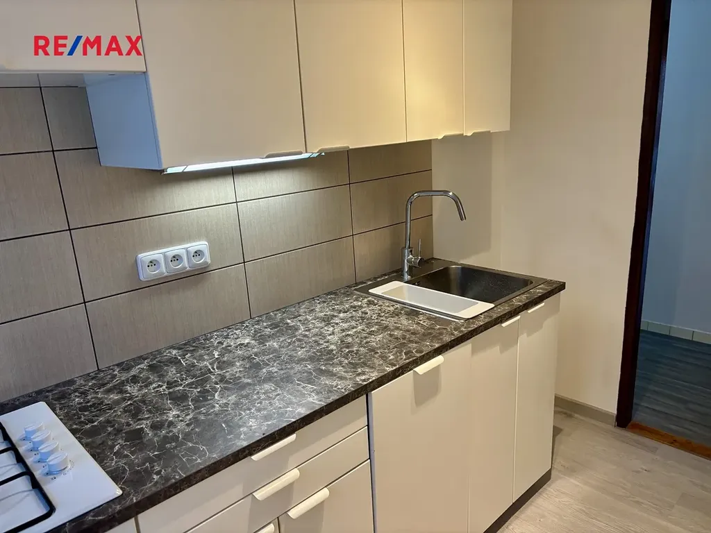Součástí bytu je funkční kuchyňská linka (bez ledničky) a koupelna vybavená sprchovým koutem a pračkou s vrchním plněním, ohřev vody v bytě zajišťuje elektrický boiler v koupelně. WC je samostatně oddělené od koupelny a podlahová krytina je keramická dlažba. Plastová okna jsou orientována na východ, jih a západ, což zajišťuje slunné prostředí po celý den. Podlahová krytina bytu je plovoucí.