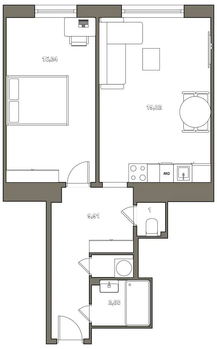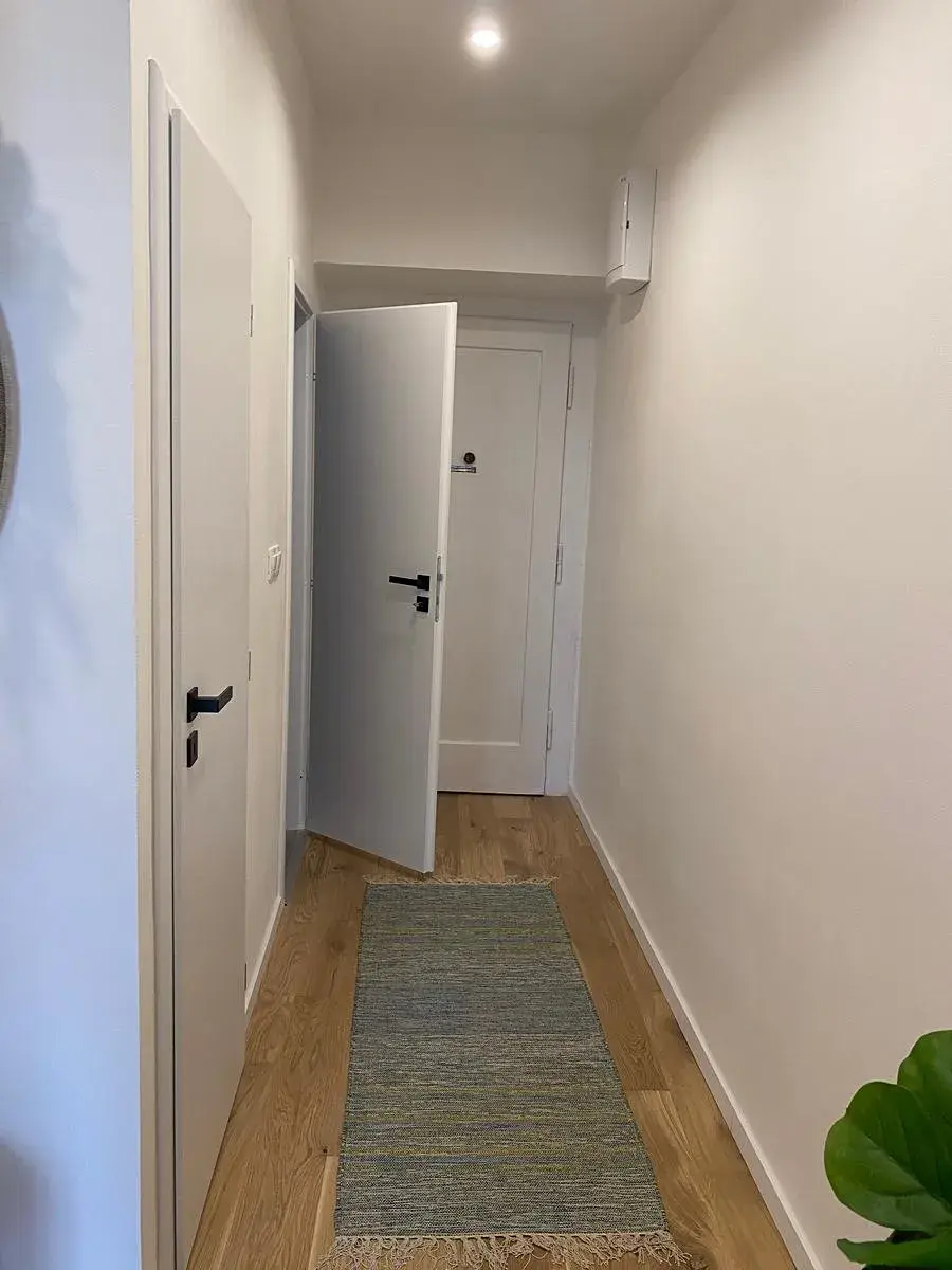 Byt se nachází ve 3.patře zrekonstruovaného domu s výtahem. Byt má celkovou plochu 47 m2, sestává ze vstupní předsíně, obývacího pokoje s kuchyní, ložnice, koupelny a WC. K bytu dále náleží sklepní kóje v suterénu domu. Byt je po rekonstrukci, na podlaze je položena dlažba a plovoucí podlaha. Moderní kuch. linka je vybavena zabudovanými spotřebiči. Byt je vybaven základním nábytkem. Vytápění je podlahové elektrické, teplou vodu ohřívá el. bojler.