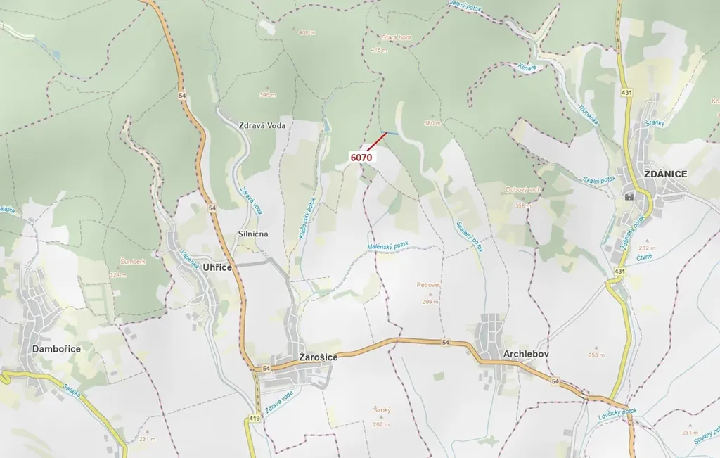 Lesní pozemek o výměře 2892 m2, parcelní číslo 6070, podíl 1/1, katastrální území Archlebov, obec Archlebov, obec s rozšířenou působností Kyjov, okres Hodonín, Jihomoravský kraj. Po těžbě.