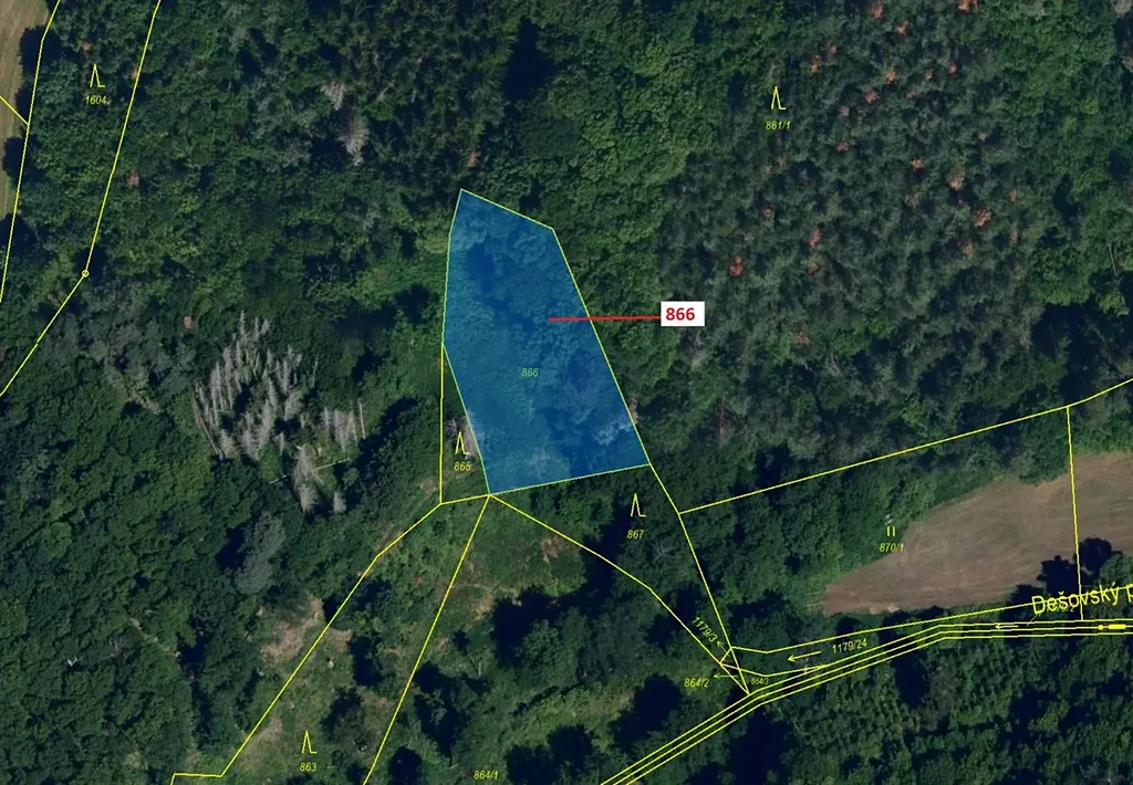 Ostatní plocha o výměře 1277 m2, parcelní číslo 866, podíl 1/1, katastrální území Malý Dešov, obec Dešov, obec s rozšířenou působností Moravské Budějovice, okres Třebíč, Kraj Vysočina.