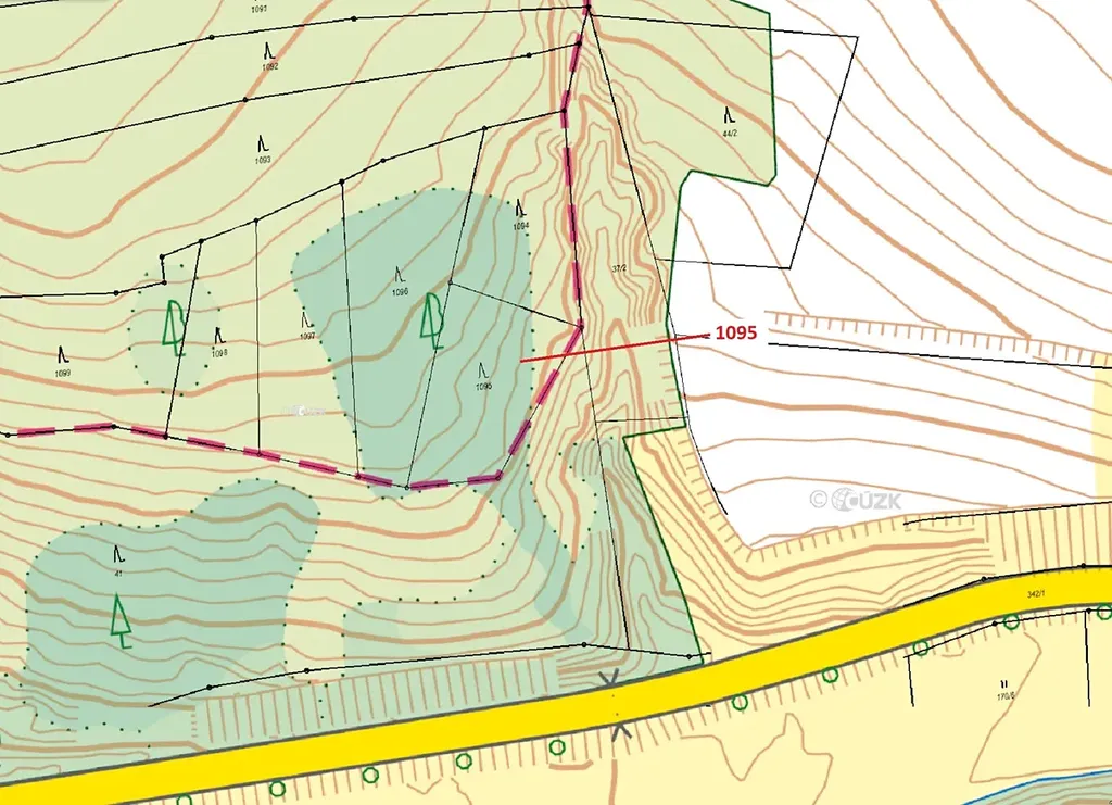 Lesní pozemek o výměře 1427 m2, parcelní číslo 1095, podíl 1/1, katastrální území Mladoňovice na Moravě, obec Mladoňovice, obec s rozšířenou působností Moravské Budějovice, okres Třebíč, Kraj Vysočina.