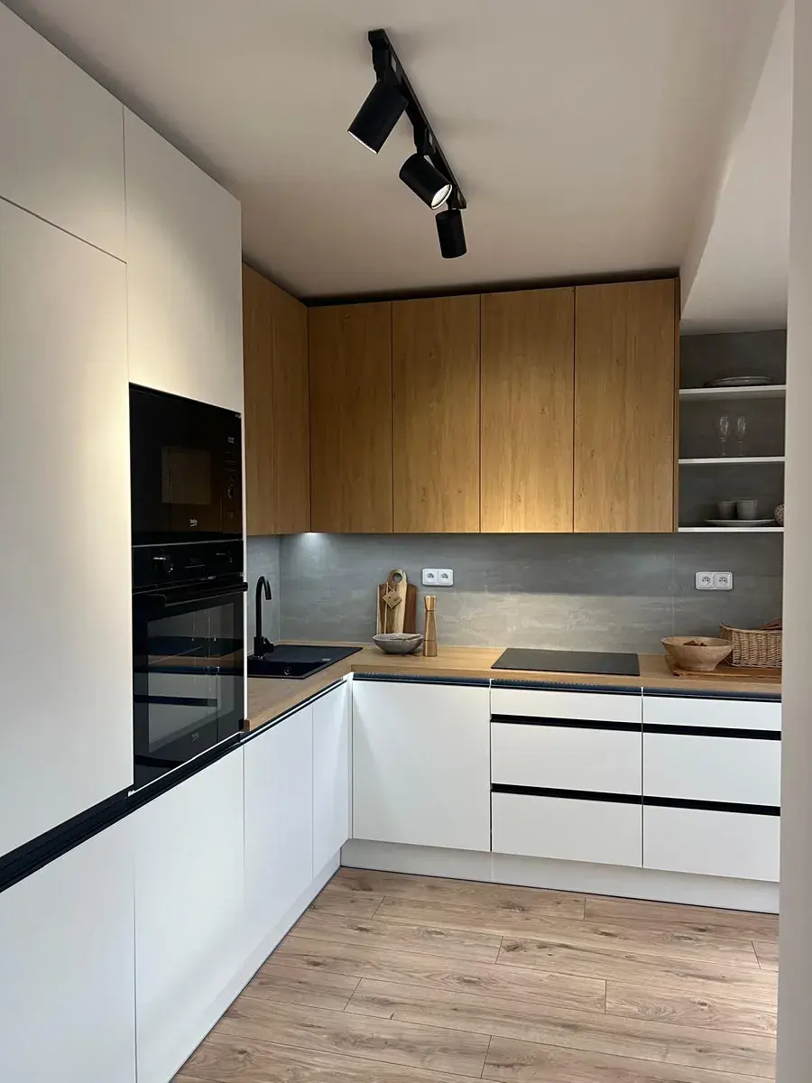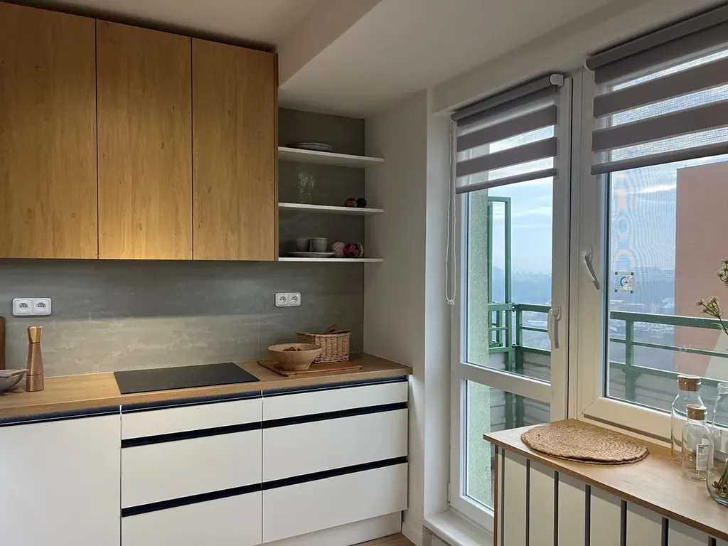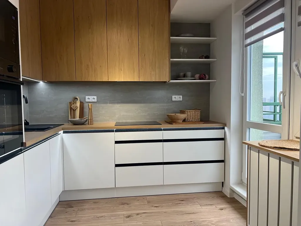 V kuchyni je nová rohová kuchyňská linka včetně spotřebičů lednice s mrazákem, indukční varná deska, horkovzdušná trouba, mikrovlnná trouba, myčka a digestoř. Z kuchyně je vstup na balkon.