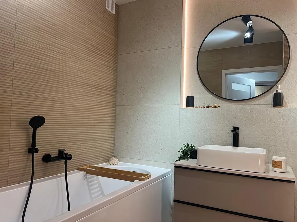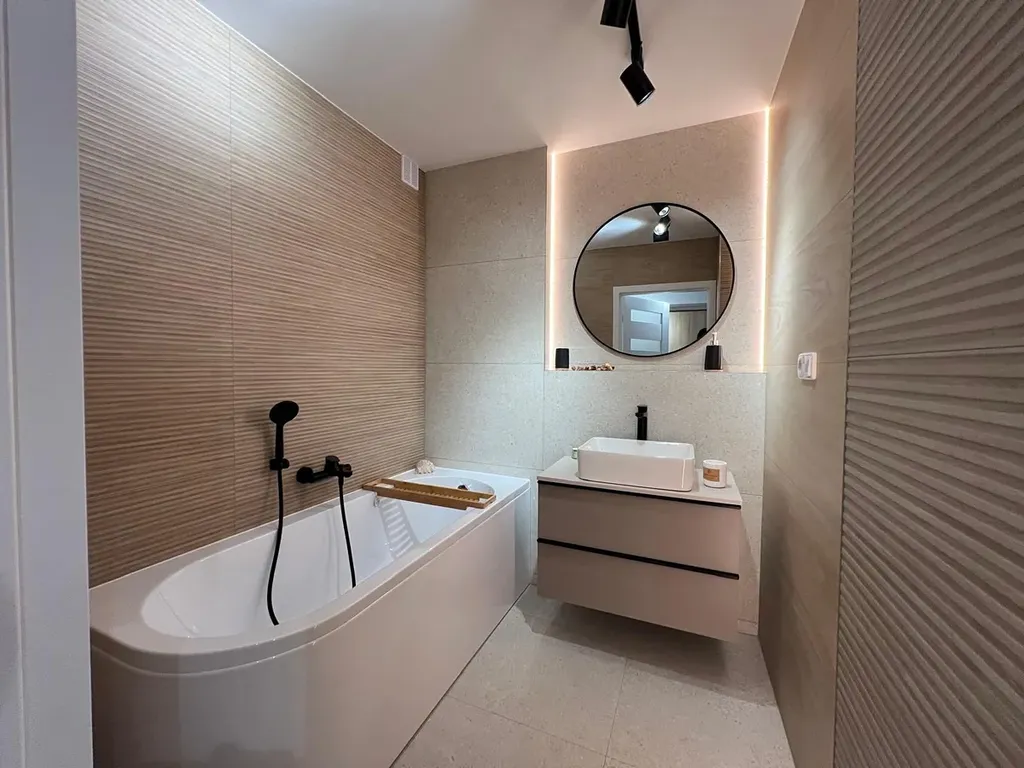 Zděné bytové jádro, prostorná koupelna s velkoformátovými obklady a dlažbou disponuje vanou, toaleta je samostatná.