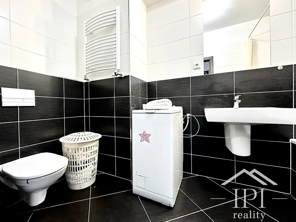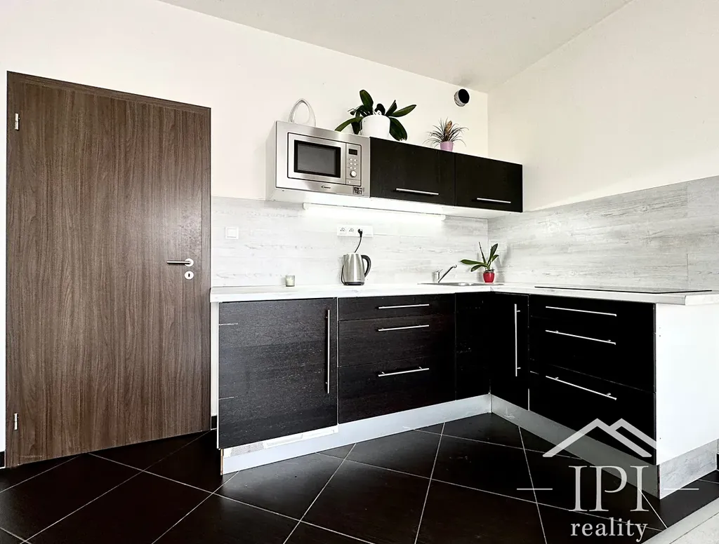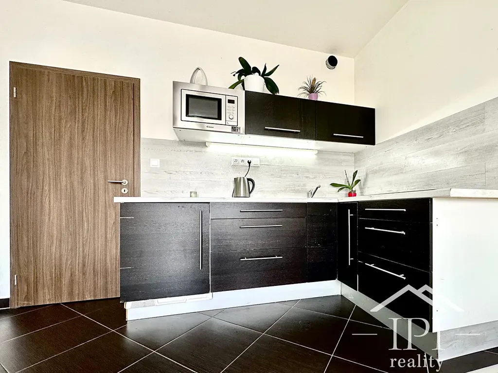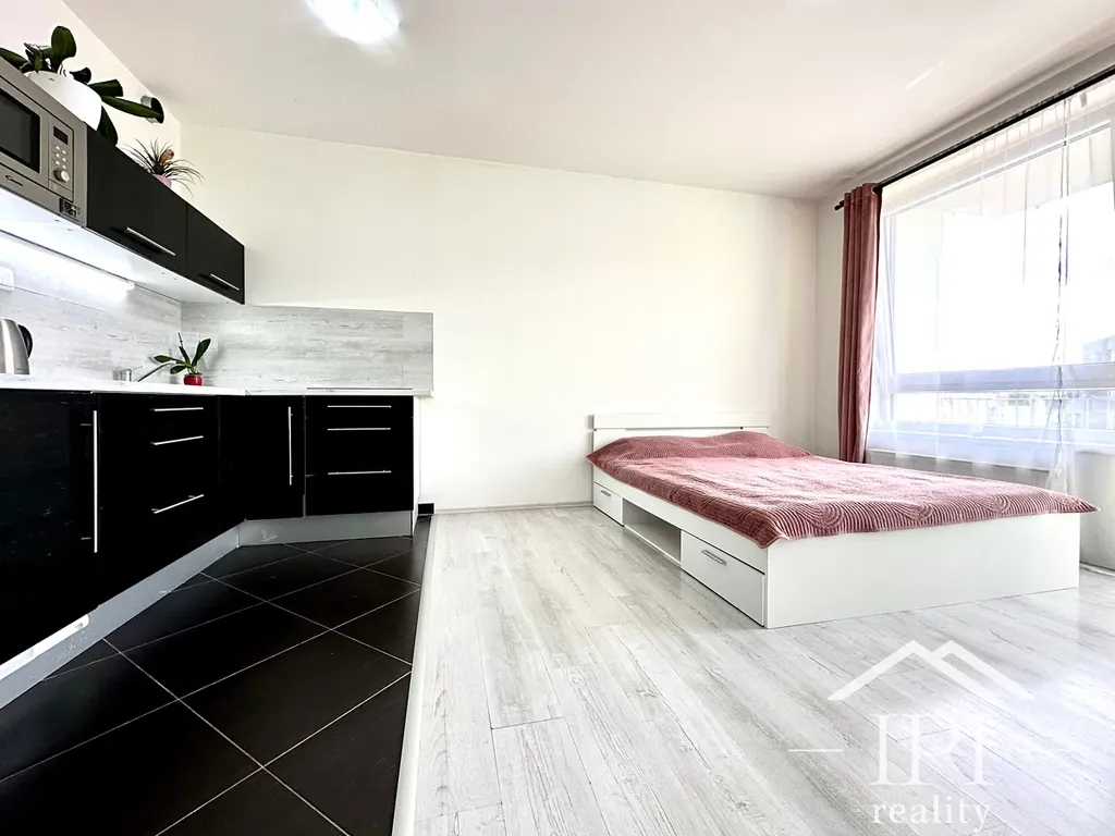 Byt je dispozičně řešen jako 1+kk, nabízí světlý obytný prostor s kuchyňským koutem vybaveným vestavěnými spotřebiči (menší lednice, varná deska, trouba). V koupelně se nachází vana, pračka, umyvadlo a toaleta. Na podlahách je plovoucí podlaha, v předsíni, kuchyňském koutě a koupelně je položena dlažba.
