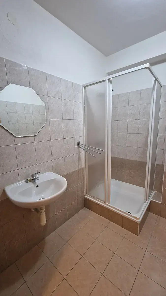 Koupelna disponuje sprchovým koutem, WC a umyvadlem. Ohřev vody zajištuje el. bojler a vytápění pak plynové těleso WAW. Podlahy jsou plovoucí v kombinaci s dlažbou.