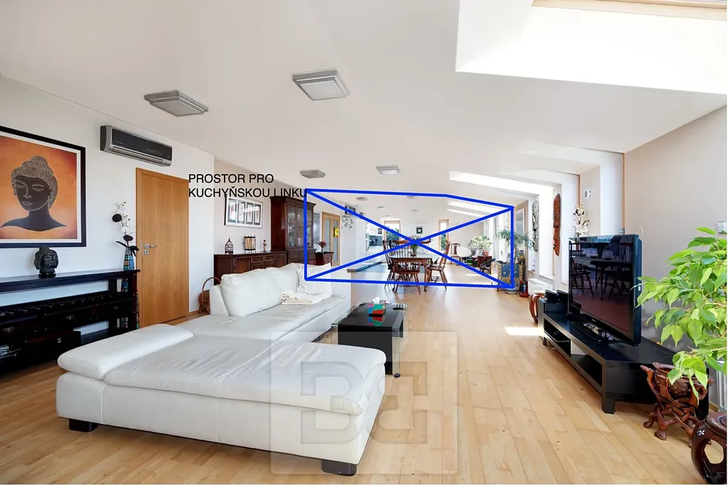 Předmětem prodeje je část současného bytu 7+kk, oddělení bytů vznikne pouhým instalováním příčky – vše předjednáno, nutno pak pouze dodělat kuchyňskou linku, ideálně hned vedle instalované příčky (rádi zajistíme). Původně, při prodeji tohoto projektu, to byly dva byty 4+kk.