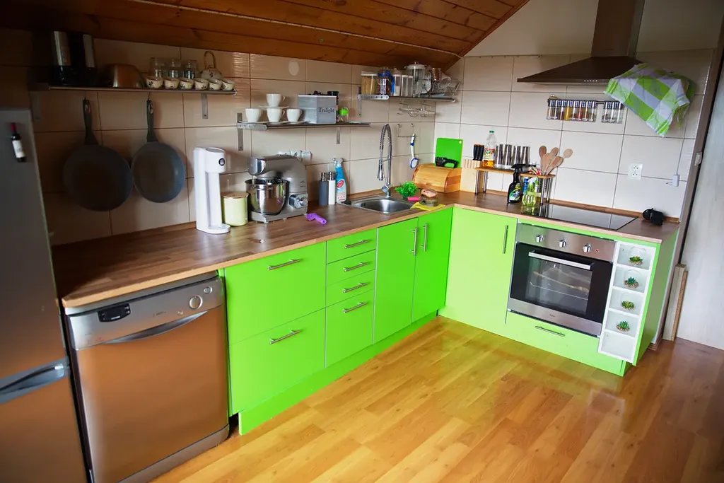 Byt je dispozičně řešen jako ateliér – otevřený prostor bez příček zahrnuje obývací část s krbovými kamny, kuchyňskou linku se spotřebiči (bez lednice), jídelnu a ložnici. Dále se zde nachází předsíň s plynovým kotlem a koupelna se sprchovým koutem a toaletou. Součástí bytu je balkon s příjemným výhledem do zahrady.