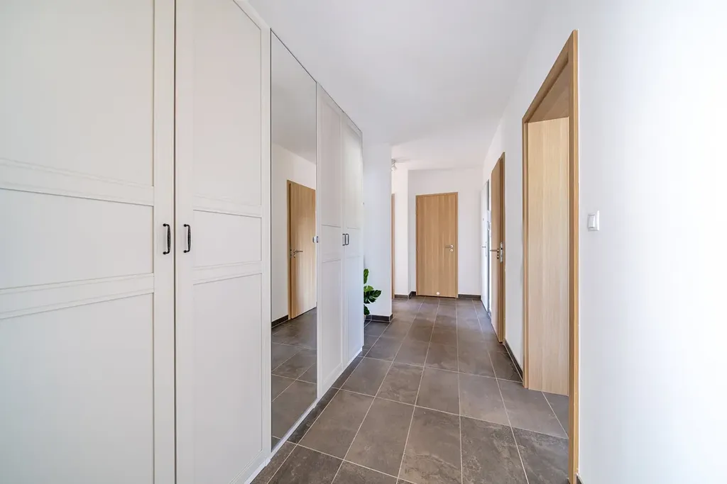 3 neprůchozí ložnice (13–14 m²), velkorysý obývací pokoj s kuchyňským koutem (34 m²), koupelna s vanou a WC, samostatná toaleta, komora s místem pro pračku/sušičku