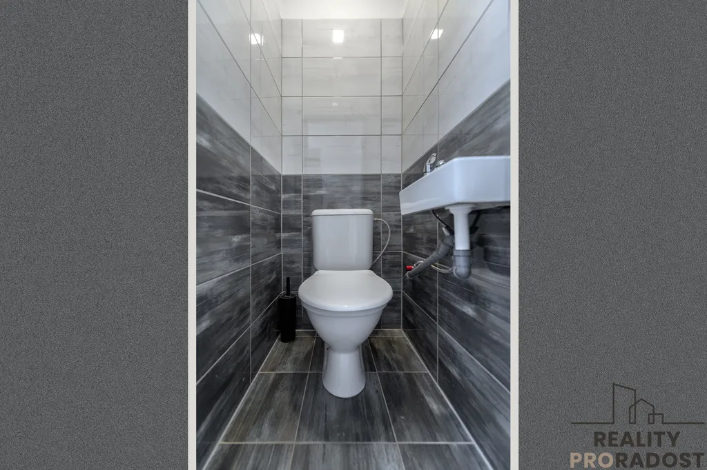 Koupelna je vybavena sprchovým koutem a umyvadlem. Toaleta je laděna do šedých tónů – kdo má rád moderní neutrální barvy, bude nadšený.