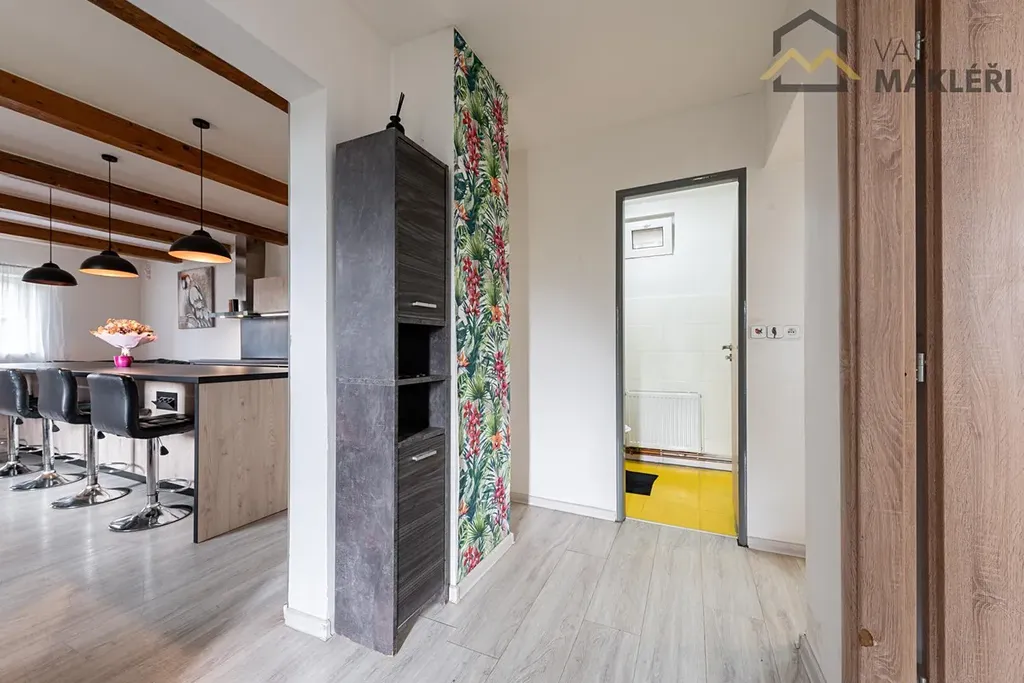 Dominantou domu je prostorný obývací pokoj s kuchyňským koutem a jídelním prostorem. Nová kuchyňská linka je vybavena moderními spotřebiči a doplněna o velký kuchyňský ostrůvek s barovým sezením.
