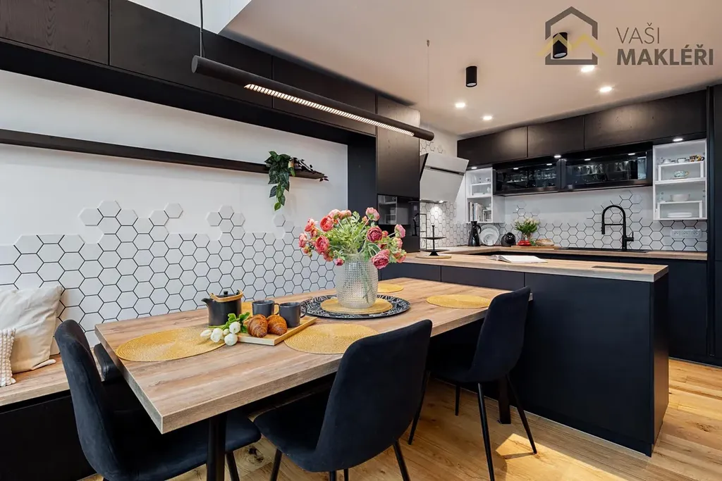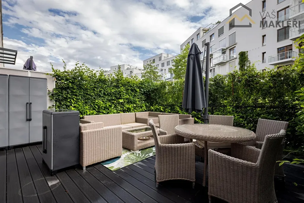 Koupelna je vybavena vanou a kvalitní sanitou, samostatná toaleta disponuje bidetovou sprškou. V celém bytě jsou dřevěné podlahy, kvalitní dlažba, elektricky ovládané předokenní žaluzie a centrální vytápění. Samozřejmostí je pračka se sušičkou, myčka, indukční varná deska, vestavěné skříně i dostatek úložných prostor. K bytu náleží sklep, kryté garážové stání i vlastní venkovní parkovací místo přímo před domem. V domě je k dispozici kočárkárna, místnost na mytí kol a psů, a především nonstop recepce s ostrahou, která zajišťuje pohodlí i bezpečí.