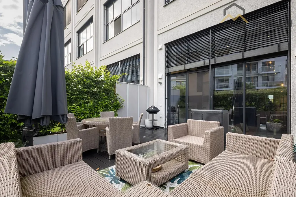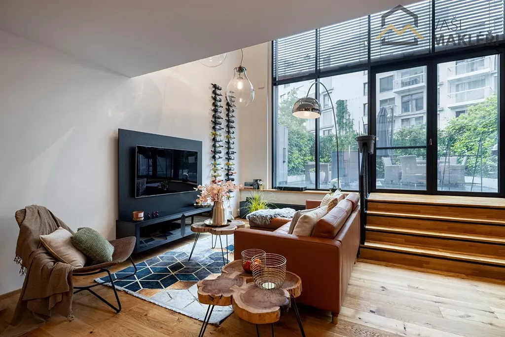 Dominantou bytu je vzdušný obývací prostor s vysokými stropy, velkoformátovými okny a plně vybavenou kuchyní na míru, odkud se vychází na útulnou předzahrádku orientovanou do zeleně. Galerii nad obývacím pokojem lze využít jako pracovnu nebo klidovou zónu, zároveň navazuje na ložnici se soukromou šatnou, umístěnou v elegantně zasklené části bytu. Dvě další ložnice jsou prakticky odděleny, každá s vlastní galerií, a nabízejí flexibilní využití podle individuálních potřeb.
