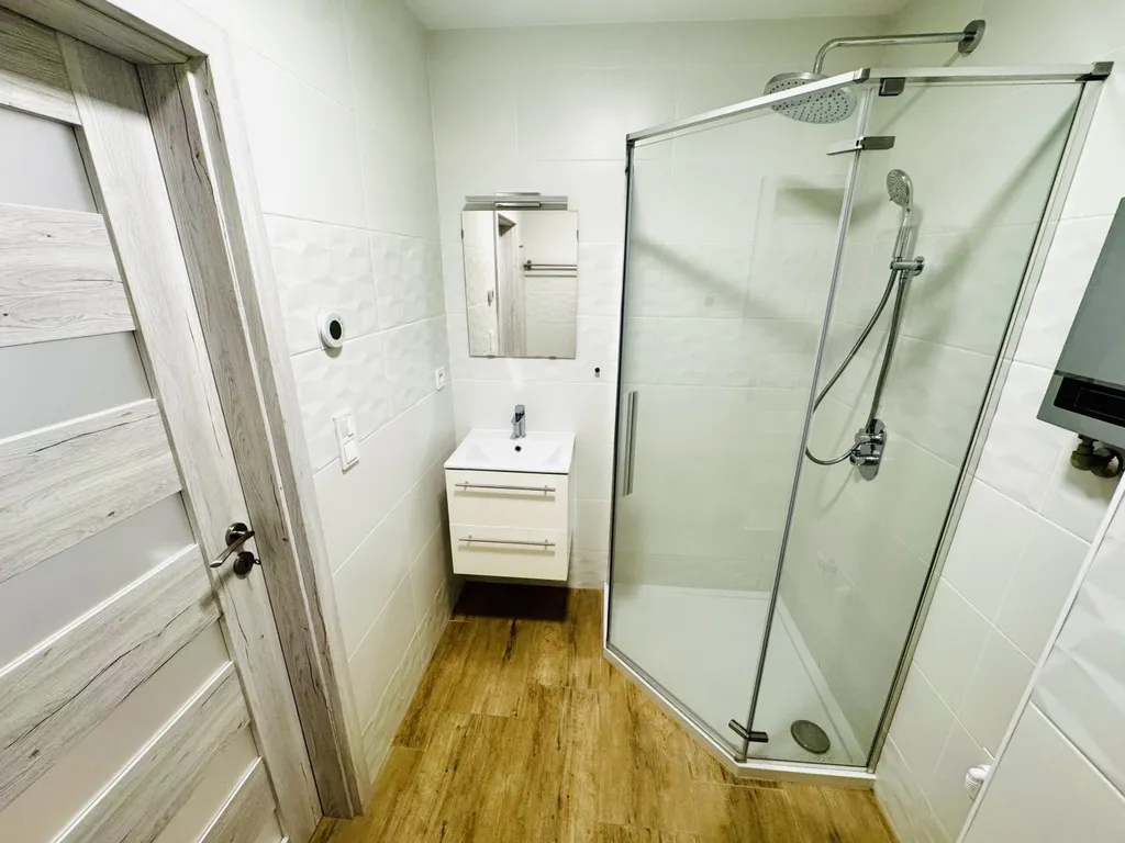 Součástí rekonstrukce je nová kuchyňská linka se spotřebiči, moderní koupelna s umývadlem, sprchou, WC a přípravou na pračku.