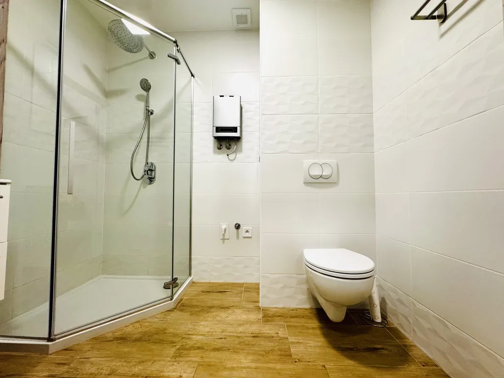 V bytě je infra vytápění s regulací přes mobilní aplikaci a optický internetový kabel.