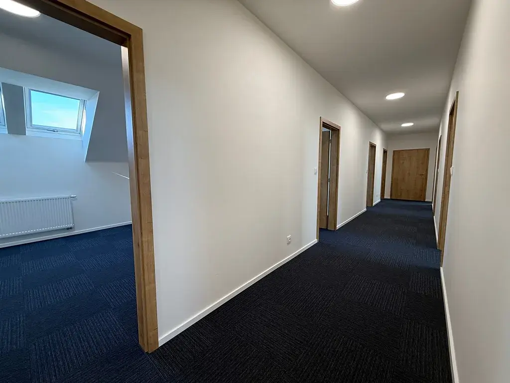 Ve vstupní hale je ideální místo pro sedačku s konferenčním místem, ale může tam také sedět například recepční či zde může být umístěn sekretariát. Kuchyňka o výměře cca 1,60m2 je vybavena lednicí, mikrovlnnou troubou a spoustou úložného prostoru. WC jsou samostatné, každé vždy s umyvadlem o výměře cca 1,26m2 a cca 2,11m2. Chodba vedoucí do jednotlivých místností má výměru cca 23,70m2. Kanceláře jsou samostatné, celkem je jich osm. Každá je vybavena klimatizací značky Sinclair, která chladí i topí. Místnosti jsou poměrně veliké a jejich výměra činí cca 12,94m2, cca 12,84m2, cca 12,76m2, cca 11,70m2, cca 14,90m2, cca 11,06m2 a 2x 12,08m2. Na konci chodby je samostatná místnost o výměře cca 3,10m2, která může sloužit jako úklidová místnost, archiv, ale i jako serverovna.