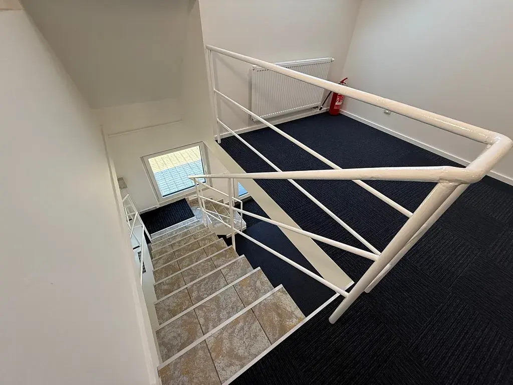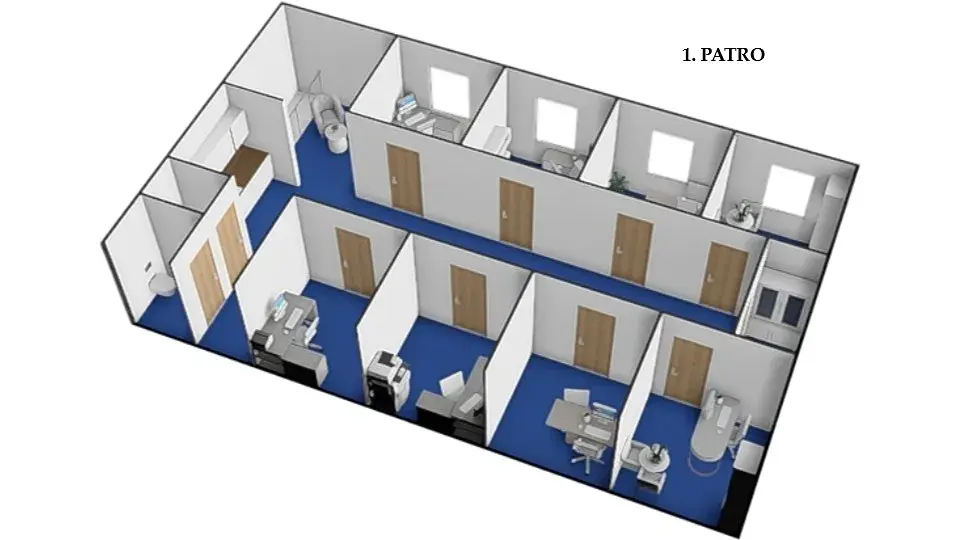 Po schodišti vejdeme do patra, kde nás přivítá vstupní hala o výměře cca 17,79m2, s kuchyní, dvěma WC (ideálně rozdělit na dámské a pánské), 8 samostatnými kancelářemi s klimatizací a skladem.