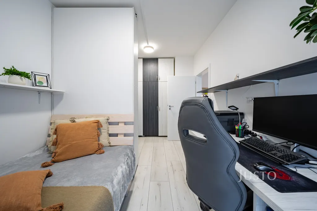 Dispozice je ideální nejen pro rodinné bydlení, ale i jako investice k pronájmu – dva neprůchozí pokoje (13,3 m² a 13 m²) poskytují dostatek soukromí i flexibilitu využití. Koupelna (9,2 m²) je vybavena vanou, sprchovým koutem a prostorem pro pračku i sušičku. Toaleta (2,8 m²) je samostatná.