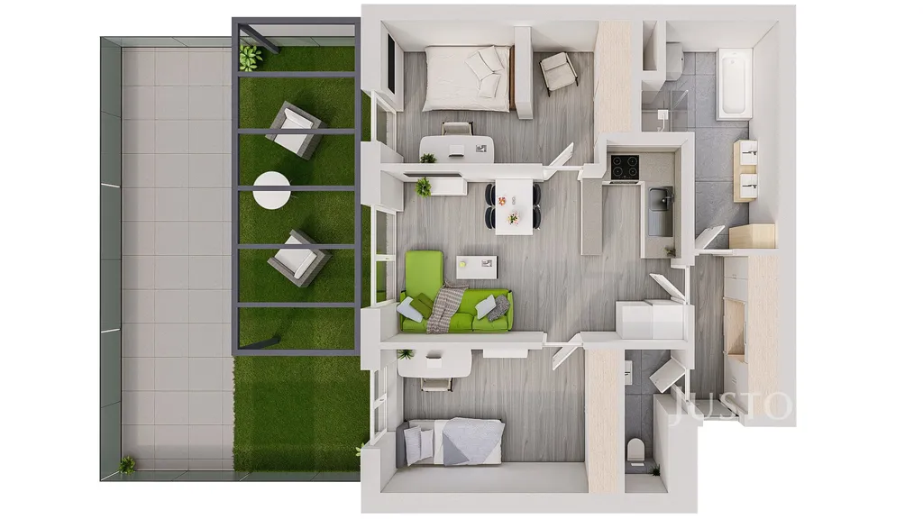 Po vstupu do bytu vás přivítá praktická předsíň (5,2 m²) s vestavěnou skříní. Z ní se dostanete do hlavního obytného prostoru – světlého obývacího pokoje s kuchyňským koutem (20,8 m²) se vstupem na terasu. Kuchyňská část je prakticky rozdělena – naleznete zde jak pracovní linku s varnou deskou, troubou, myčkou a dřezem, ale také oddělenou vestavnou část s mikrovlnkou, prostorem pro lednici a dostatkem úložných skříněk.
