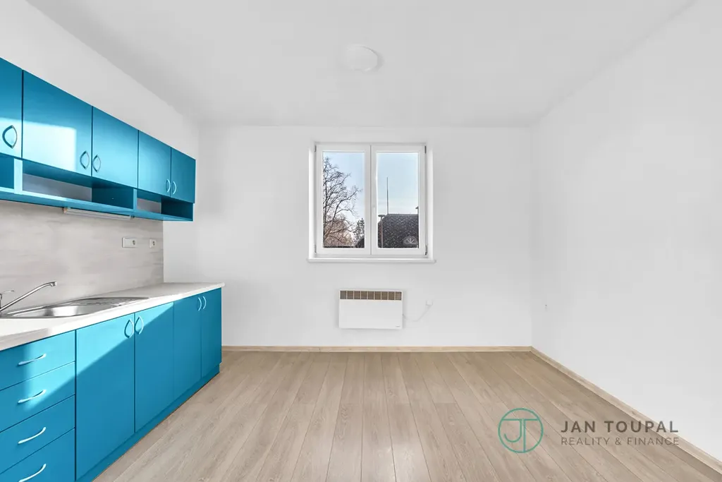 Dispozice zahrnuje vstupní chodbu, samostatné WC, koupelnu se sprchovým koutem a zavěšeným boilerem, kuchyň s prostornou místností, která je průchozí do dalšího pokoje. Součástí vybavení je starší kuchyňská linka. Vytápění je řešeno elektrickými přímotopy, ohřev vody zajišťuje boiler.