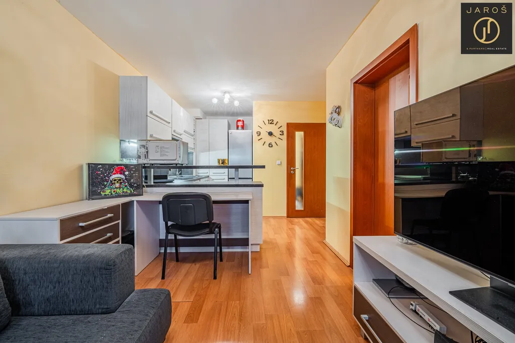 Obývací pokoj díky dvěma oknům působí vzdušně a nabízí dostatek prostoru pro sedací soupravu i televizní stěnu. Kuchyňská linka je moderní, vybavená vestavěnými spotřebiči a disponuje velkým množstvím úložných prostor. Ložnice je příjemně oddělená od denní části a umožňuje pohodlné umístění velké postele i dalšího vybavení podle potřeb nového majitele. Koupelna je prostorná, se sprchovým koutem a místem pro pračku. Toaleta je součástí koupelny. Vstupní chodba nabízí praktickou vestavěnou skříň.