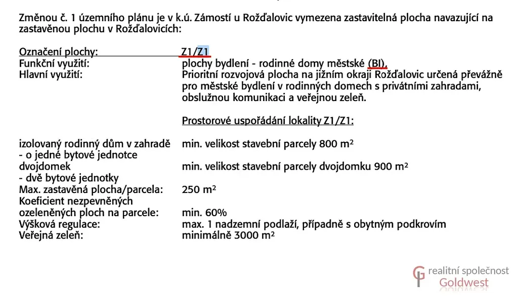 Dle územního plánu je určený k zástavbě a označený Z1/Z1 (BI). - plochy bydlení městské v rodinných domech s privátními zahradami, max. 1 nadzemní podlaží, případně s obytným podkrovím. Zastavěnost pozemku 250 m2, koeficient nezpevněných ozeleněných ploch min. 60%, možnost stavby i dvojdomu na parcelách o min. velikosti 900 m2.