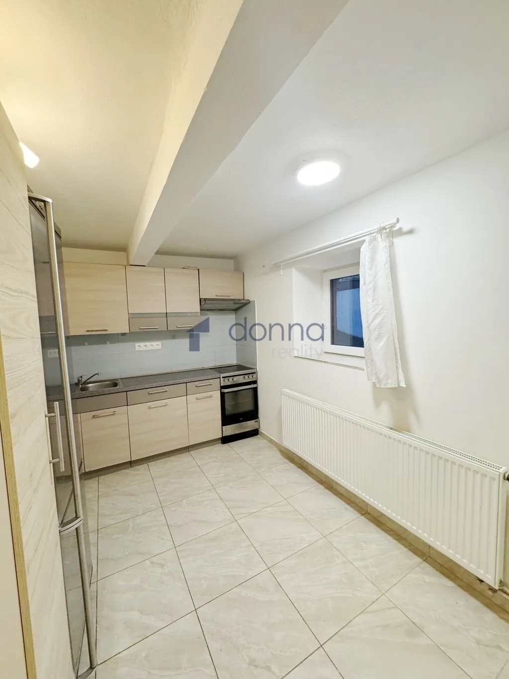 Byt se nabízí bez nábytku - je zde kuchyňská linka se spotřebiči - sporák, digestoř, lednice.